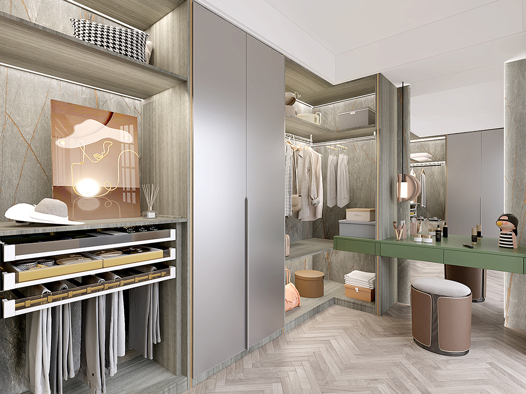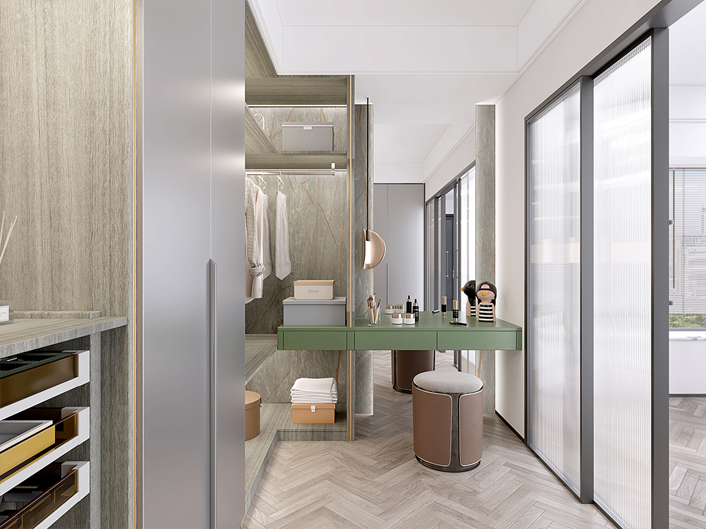 U型布局,装尽所爱;贴合分寸,宛若天成;转角设计,惟妙惟肖;整面大衣柜,收纳更从容;半开放衣柜设计,增强空间整体性;嵌入式梳妆台,穿衣打扮利器;光影衣帽间,为你的衣服找到一个家。